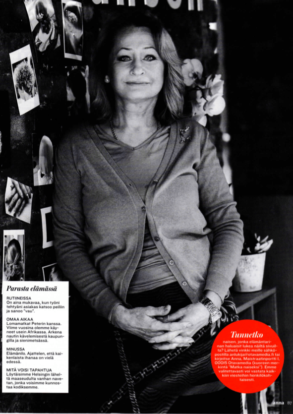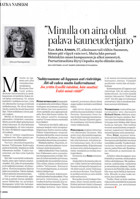 ”Kun Aina Anson aikoinaan tuli töihin Suomeen, hänen piti viipyä vain tovi. Mutta hän perusti Helsinkiin oman kampaamon ja alkoi menestyä.”